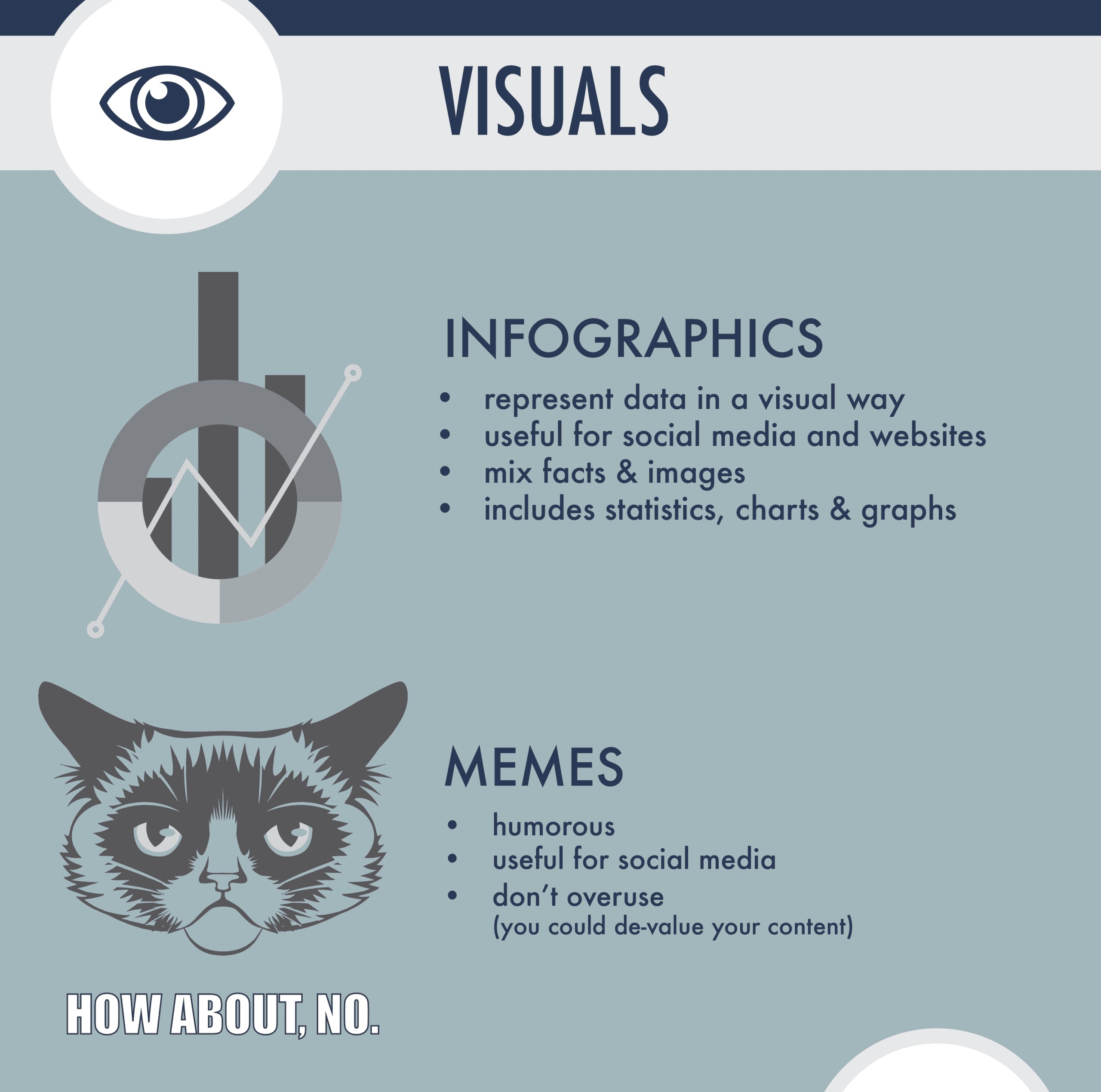 Visual content consists of well, visuals. Visual content is usually created in the form of photos, graphics, infographics or even memes.